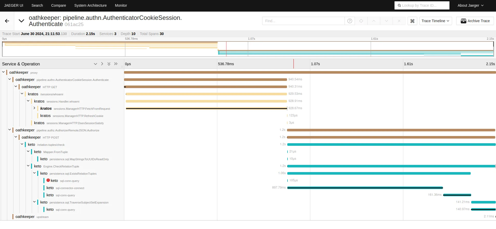 If you configure the tracing of Ory products, you will have a view in your Jaeger dashboard similar to what you see below.